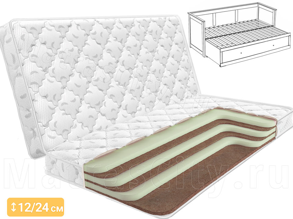 ВНИМАНИЕ: слои матраса располагаются так, что в сложенном положении кровати наверху находится пена и матрас мягче. Когда кровать и матрас разложены, сверху — кокосовая койра и спальное место ощущается более жестким.